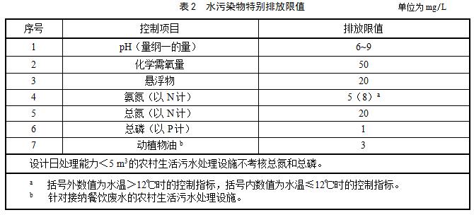 5.2.3農(nóng)村生活污水處理設(shè)施處于環(huán)境容量較小、生態(tài)環(huán)境脆弱,容易發(fā)生環(huán)境污染問題而需要采取特別保護(hù)措施的地區(qū),應(yīng)不區(qū)分受納水體的水環(huán)境功能和設(shè)施設(shè)計(jì)日處理能力,按表2的規(guī)定執(zhí)行水污染物特別排放限值。執(zhí)行水污染物特別排放限值的地域范圍、時(shí)間,由設(shè)區(qū)市人民政府規(guī)定。