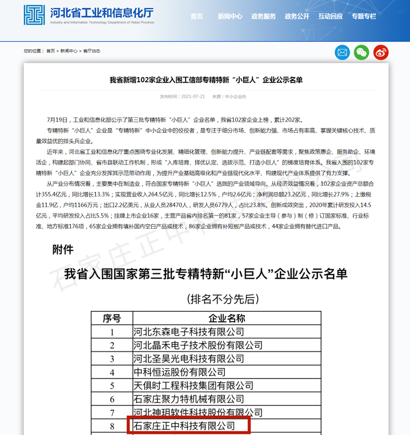 日前,工業(yè)和信息化部公示了第三批專精特新“小巨人”企業(yè)名單。專精特新“小巨人”企業(yè)是“專精特新”中小企業(yè)中的佼佼者,是專注于細分市場、創(chuàng)新能力強、市場占有率高、掌握關(guān)鍵核心技術(shù)、質(zhì)量效益優(yōu)的排頭兵企業(yè)。經(jīng)過重重選拔,石家莊正中科技有限公司在眾多優(yōu)秀企業(yè)中脫穎而出,榜上有名,彰顯其在技術(shù)創(chuàng)新、企業(yè)綜合實力和高質(zhì)量發(fā)展等方面得到了高度的肯定。
